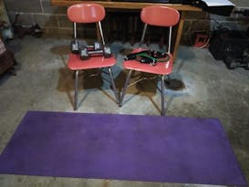 This is some of the equipment I train with: dumbbells, resistance bands, chairs and yoga mat